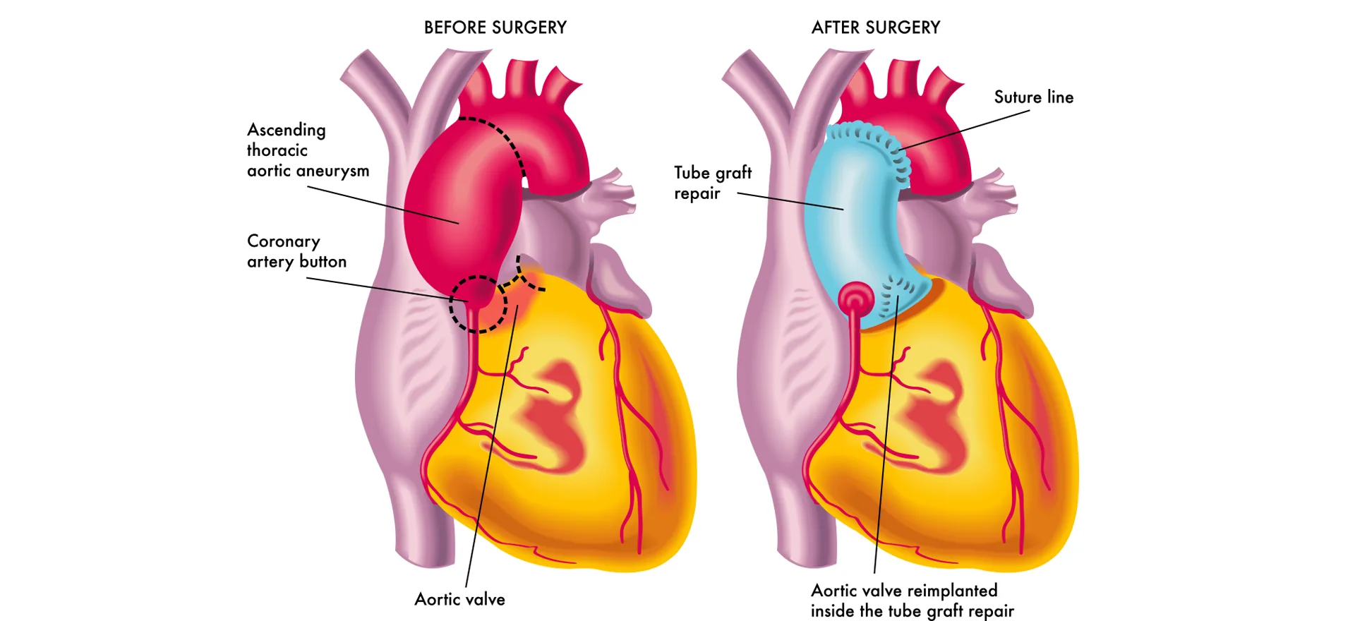 The aortic root is the area that connects the aorta to the left ventricle, the heart’s main pumping chamber, and contains the aortic valve. The aortic valve manages the flow of blood from the left ventricle to the aorta. David’s surgery is an operation to correct problems with the aortic root and aortic valve, in which the aortic valves are preserved. This technique is usually applied in cases of aortic dissection, aortic aneurysm, aortic valve insufficiency. The main purpose of David surgery is to preserve the aortic valve while replacing the aortic root. Thus, the function of the patient’s own natural aortic valve can continue.